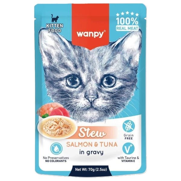 طعام رطب خالٍ من الحبوب مخصص للقطط الصغيرة. مصنوعة من سلمون وتونة حقيقية في صلصة لذيذة، توفر بروتين عالي الجودة وترطيب لدعم النمو الصحي. خالية من المواد الحافظة والأصباغ الصناعية، وتتضمن التورين وفيتامين E لصحة البشرة والفرو، وأحماض أوميغا-3 الدهنية