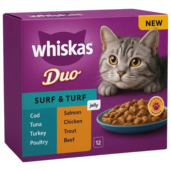 ويسكاس سيرف آند تيرف في جيلي النكهات: سمك القد، سمك السلمون، التونة، الدواجن، الدجاج، الديك الرومي، اللحم البقري، سمك التروت