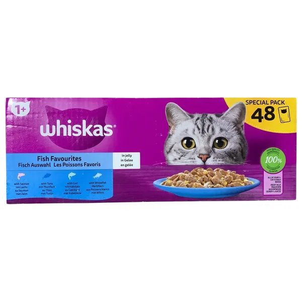 عبوة متنوعة لذيذة للقطط البالغة، تحتوي على قطع سمك حقيقية في جيلي شهي. تشمل التشكيلة سمك السلمون والتونة والقد والسمك الأبيض في أكياس فردية سهلة الاستخدام