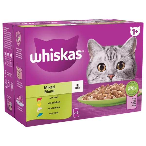 قائمة طعام ويسكاس المشكلة بالجيلي النكهات: لحم بقري ودجاج وسلمون وتونة