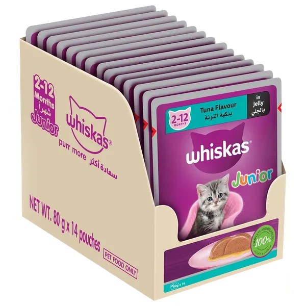 طعام قطط رطب بنكهة التونة في صلصة جيلي، مصمم للقطط الصغيرة من عمر 2–12 شهرًا. يحتوي على تونة حقيقية وألياف طبيعية لدعم صحة الجهاز الهضمي، وكالسيوم لتعزيز نمو الأسنان والعظام. غني بـ 41 عنصرًا غذائيًا أساسيًا، بما في ذلك DHA وأوميغا-3 لدعم نمو الدماغ والرؤية، ومضادات الأكسدة لتعزيز المناعة. تأتي القطع بحجم صغير مناسب لتسهيل الأكل والهضم.