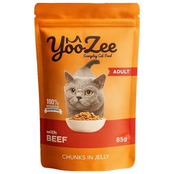 طعام القطط البالغة من يوزي مع قطع لحم البقر في الجيلي - 85 غم