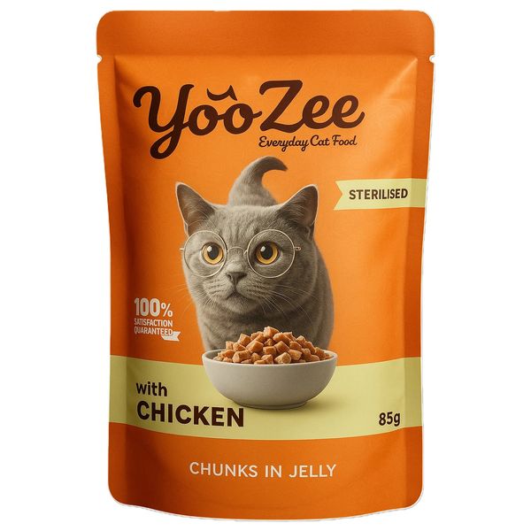 طعام القطط المعقمة بنكهة الدجاج يحتوي على قطع شهية في جيلي، مصمم للقطط المعقمة التي تبحث عن وجبة متوازنة ولذيذة