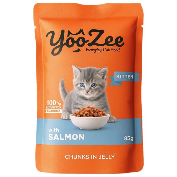 طعام القطط الصغيرة يوزي مع قطع السلمون في الجيلي - 85 غم