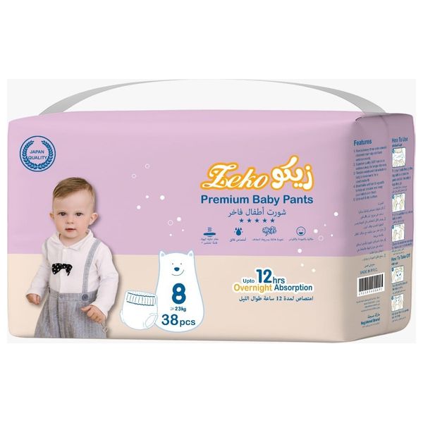 حماية موثوقة مع حفاضات زيكو بريميوم بيبي بانتس سهلة الارتداء. مقاس 8 للأطفال الصغار الذين يزيد وزنهم عن 23 كجم، توفر امتصاصًا يصل إلى 12 ساعة طوال الليل، وتصميم سهل الارتداء لتغيير سريع