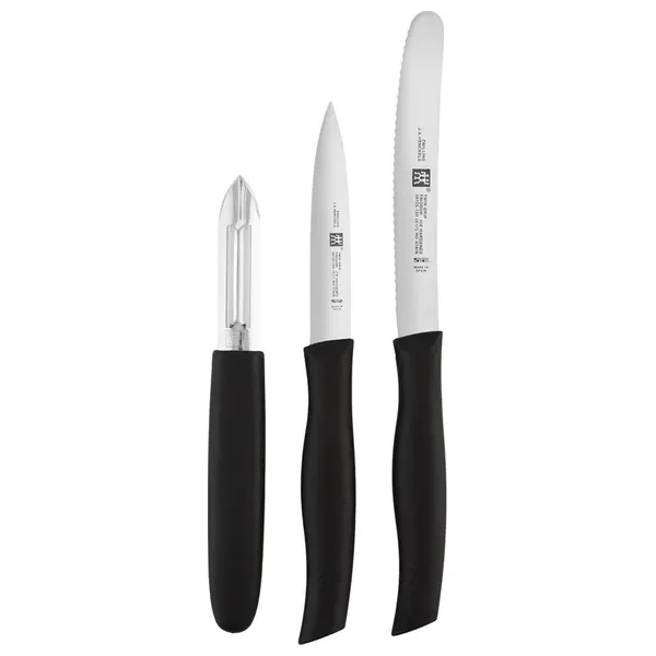 طقم السكاكين الثلاثي TWIN Grip من زيلينج مصمم لتسهيل العمل في المطبخ وزيادة كفاءته. يتضمن الطقم سكينًا للتقشير والزينة، وسكين تقشير، وسكين متعددة الاستخدامات، كل منها مصمم لغرض محدد. تتميز جميع السكاكين بشفرات FRIODUR® مقسّاة بالثلج، مما يوفر حدة استثنائية ودقة عالية واحتفاظ طويل بالحدّة. مصنوعة من الفولاذ المقاوم للصدأ الخاص، هذه السكاكين قوية ومقاومة للتآكل ومثالية لتقطيع الفواكه والخضروات واللحوم وغيرها بسهولة.