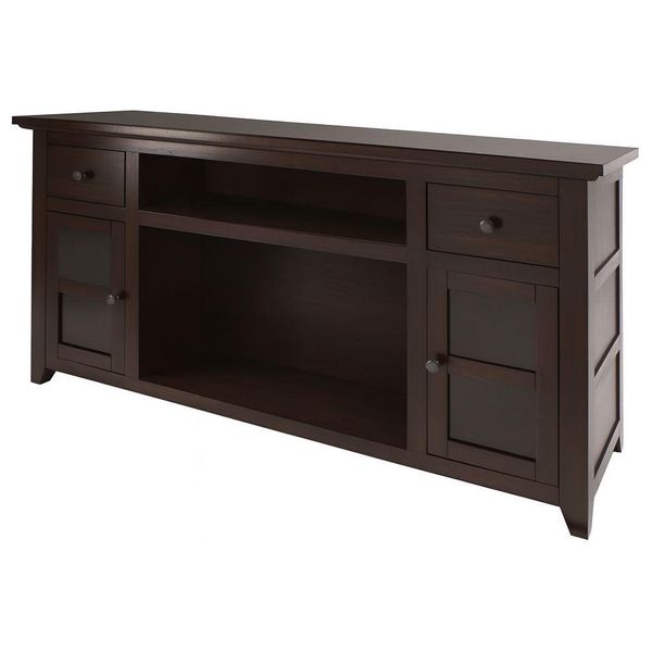 The 1st Shine walnut TV stand combines a rich finish with practical storage for modern living rooms. It measures 140 cm wide, 80 cm high and 40 cm deep, designed to accommodate 55–65 inch televisions. The centerpiece features an open center shelf and a wide open compartment, flanked by two drawers and two glass-front cabinets for organized storage of remotes, consoles, and accessories.