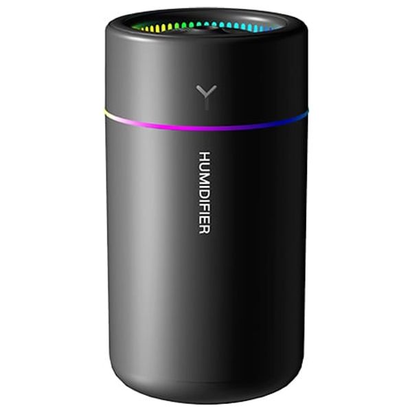 This portable humidifier features a sleek, cylindrical design, providing a fine mist to reduce dryness in rooms or cars. It operates in two modes (continuous or intermittent) with dimmable RGB ambient lighting, and boasts ultra-quiet operation and automatic shut-off when the water runs out. It has an approximate 300ml tank capacity.