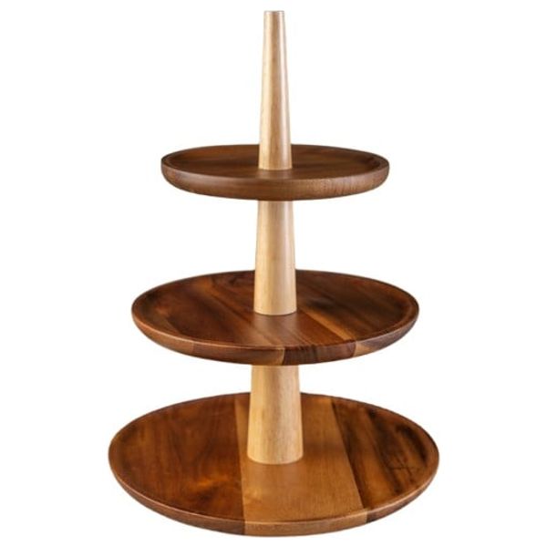 This 3-tier wooden serving stand presents a warm, natural wood finish for displaying desserts, fruits, appetizers, or pastries. Its three-level design provides an elegant, space-saving presentation for gatherings or home entertaining. Crafted from natural wood, the stand adds a timeless decorative touch to any table or counter.