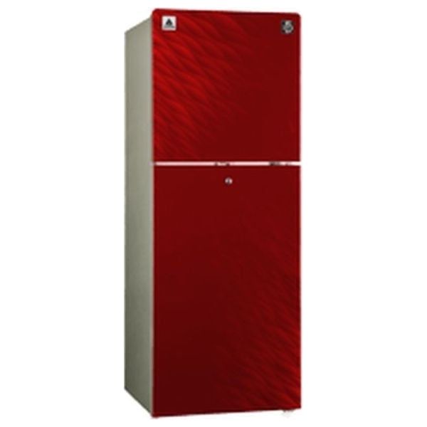 The Alhafidh RFHA-TM299DCR is a two-door conventional refrigerator finished in red. It offers a 10 ft capacity with a tropical compressor ensuring reliable cooling in warm climates, and features adjustable glass shelves for flexible storage. Net dimensions are 519 mm wide, 1485 mm tall, and 577 mm deep, making it suitable for kitchen spaces in Iraqi homes.