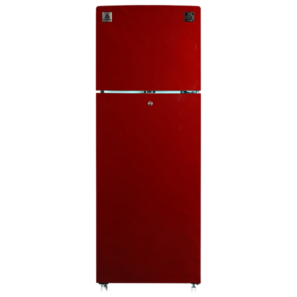 Alhafidh RFHA-TM455DCR is a 16 ft conventional double-door refrigerator finished in red. It features a glossy glass door, adjustable glass shelves, and a freezer cooling function. Net dimensions: width 595 mm, height 1747 mm, depth 576 mm. Ideal for family kitchens in Iraq.