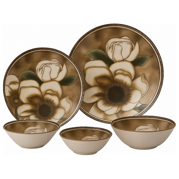 Durable, scratch-resistant ceramic set includes a variety of items for serving everyday meals and special occasions: 6 small soup plates, 6 large soup plates, 6 salad plates, 6 fruit plates, and 6 serving plates