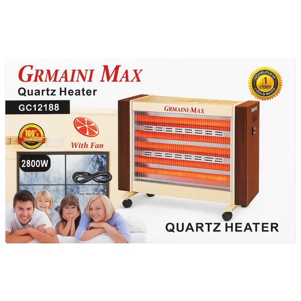 This 2800W radiant quartz heater provides efficient and rapid heating thanks to its 6 quartz heating elements (4+2) for optimal heat distribution. It features a turbo fan to accelerate hot air flow and an adjustable thermostat for precise temperature control. The heater has a durable metal frame, bottom wheels for easy movement between rooms, and a safety switch to prevent tipping over for safe use.