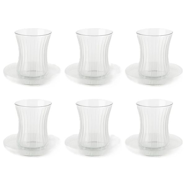 Includes 6 clear tea cups with matching saucers, elegant glass design with vertical lines, durable for everyday use and suitable for serving tea during hospitality
