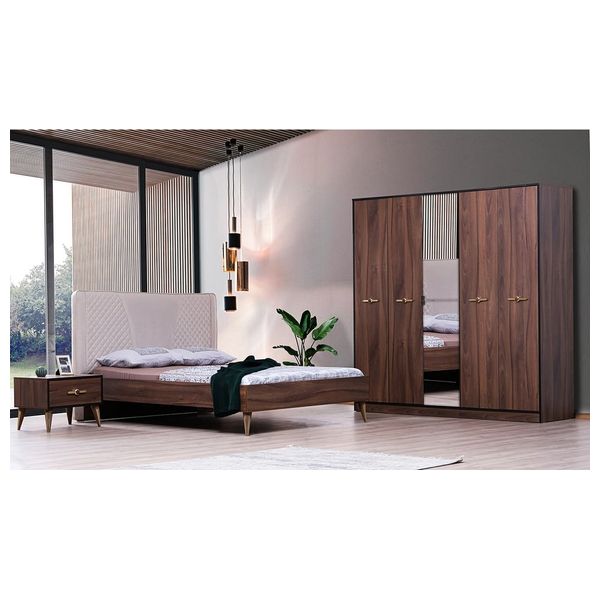 The set consists of five pieces including a bed, a pair of bedside tables, a wardrobe with a mirror, and a chest of drawers for organized storage. Its sturdy design provides a practical solution for storing belongings and organizing the bedroom, all while maintaining a unified and attractive look.