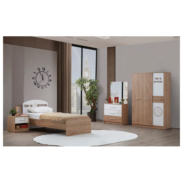 Seven pieces with a modern design, providing a complete and practical solution for a bedroom, including a 100x200 cm bed, a wardrobe, a dresser with a mirror, and a closet.