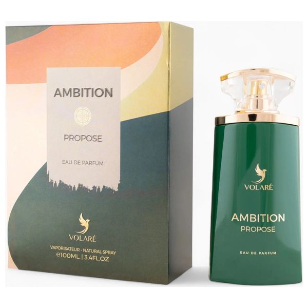 Ambition Propose by Volare is a unisex Eau de Parfum with a fresh pear opening and incense, revealing a heart of saffron, rose, jasmine sambac and osmanthus, and a warm base of rock rose, sandalwood, akigala wood, amber and vanilla. This versatile fragrance suits daily wear and special occasions, delivering a refined scent profile ideal settings.