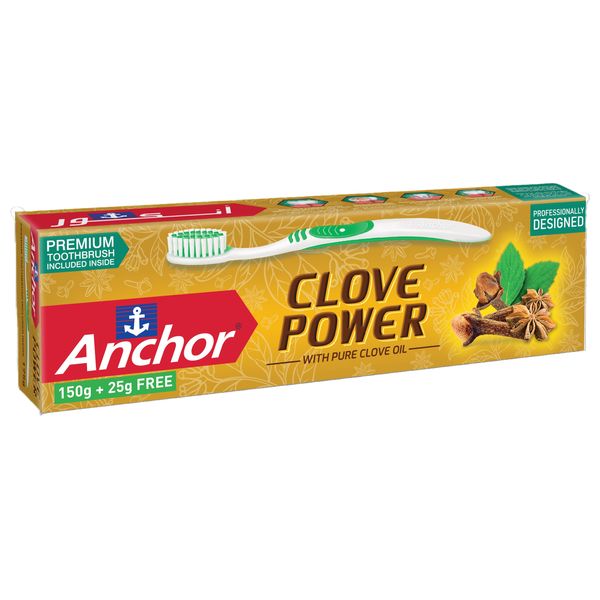 Anchor Clove Power toothpaste with pure clove oil provides a refreshing clean for daily oral care. The 175g tube includes a premium toothbrush for a complete and convenient solution, helping you start your day with a fresh feeling in your mouth.