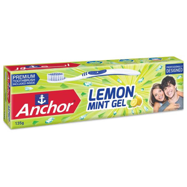Anchor Lemon Mint Gel Toothpaste offers refreshing lemon and mint flavor in a gel formula. The package includes a brush, providing a convenient oral care kit for daily cleaning. This toothpaste supports essential teeth cleaning and fresh breath