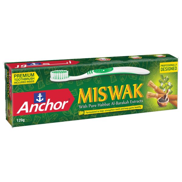 Anchor Miswak toothpaste combines traditional oral care with modern protection. This 120g toothpaste is formulated with pure black seed extract to strengthen teeth and maintain healthy gums. The product includes a premium toothbrush for a complete daily routine.