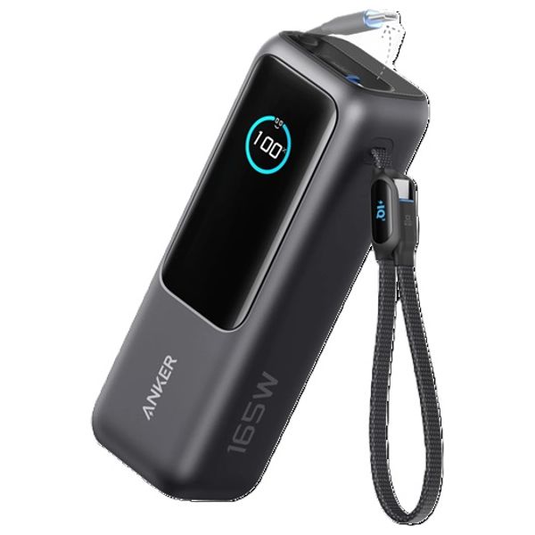 The Anker 25K-165W power bank provides fast, versatile charging for laptops, phones, and more. Each USB-C port delivers up to 100W, with a total output of 165W to power high-demand devices. The 25,000 mAh capacity supports extended use, and a real-time smart display shows remaining capacity, outputs, inputs, and recharge times. ActiveShield 2.0 temperature protection helps keep your devices safe during charging. It can charge a MacBook Pro (M3) 16-inch to about 50% in ~33 minutes and an iPhone to ~50% in ~25 minutes.