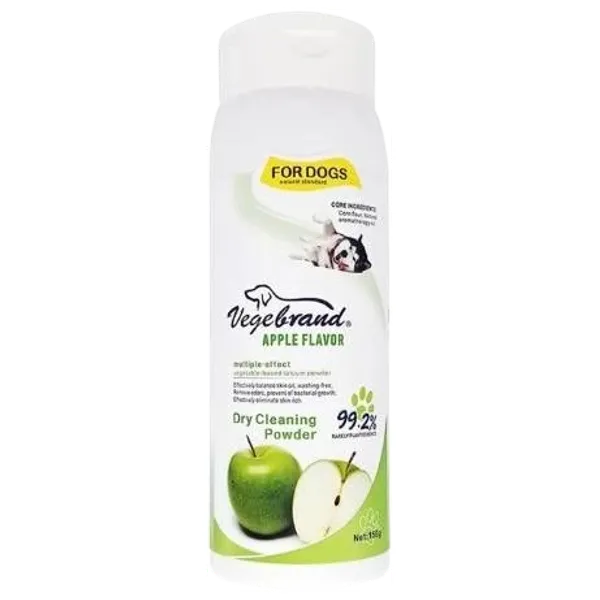 Apple-scented dry cleaning powder is a convenient option for cleaning dogs. It helps refresh the coat and remove dirt and odors between baths without water. Application is simple: sprinkle a small amount onto the coat, rub gently, then brush the fur to remove residue and leave a pleasant scent.