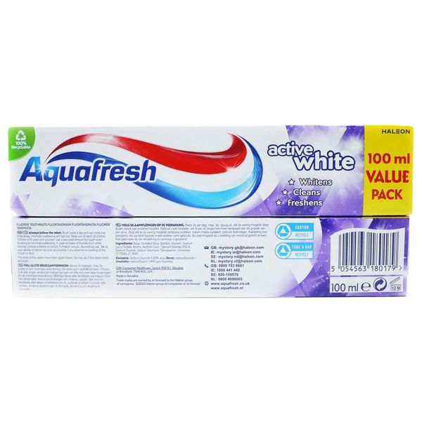 Aquafresh Active White toothpaste is specially formulated to gently remove surface stains and restore the natural whiteness of your teeth. Featuring a triple-action formula, it provides effective cavity protection with fluoride, deep cleaning for a sparkling smile, and long-lasting fresh breath. Suitable for daily use, this toothpaste helps support strong teeth and healthy gums, ensuring a comprehensive oral care experience.