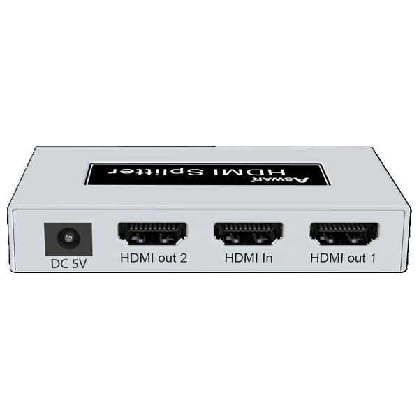 The Aswar AS-HDMI-SP12 HDMI splitter distributes a single HDMI source to two displays. It supports 4K resolution up to 3840x2160 at 30 Hz for sharp, smooth visuals. Featuring one HDMI input and two HDMI outputs, it operates with a 5V DC power supply. Its compact white enclosure (20x20x20 mm) makes it easy to place in home theaters, desks, or small office setups, delivering reliable video distribution without software.