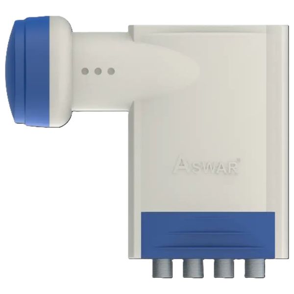 ASWAR KU4A is a four-port KU-band LNB designed for home satellite reception. Its IP66-rated enclosure protects against harsh weather, enabling outdoor installation. It features an input frequency range of 10.7–12.75 GHz, an output frequency range of 950–2150 MHz, a low noise figure of 0.3 dB, and four output ports for connecting multiple receivers.