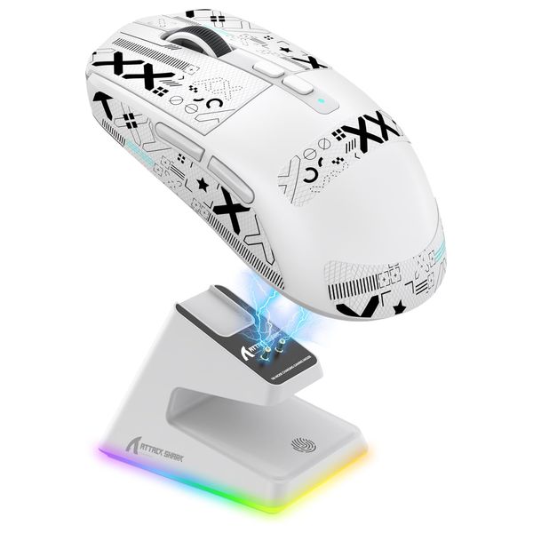 The ATTACK SHARK X6 is an ultra-light wireless gaming mouse designed for precision and comfort. Weighing only 49 g, it features a PixArt PAW3395 optical sensor offering up to 26,000 DPI with six adjustable levels, 650 IPS tracking, 1000 Hz polling, and 50G acceleration for rapid, accurate response. The mouse includes a touch-enabled RGB charging base with long-lasting battery life up to 200 hours. HUANO switches and a TTC encoder provide a reliable, crisp click and smooth scroll. Connectivity is flexible with USB-C wired, 2.4G wireless, and Bluetooth 5.2, supporting up to four devices simultaneously. Five programmable buttons allow DPI, polling rate, macros, and shortcuts customization via the accompanying software.