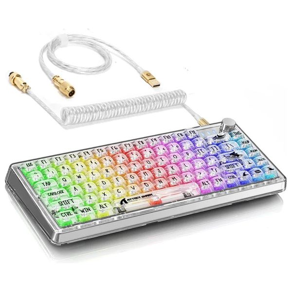 ATTACK SHARK K75 TKL transparent mechanical keyboard with open-source QMK/VIA support, linear switches, RGB lighting, hot-swappable PCB, and unique knob and coiled USB-C cable for gaming and customization.