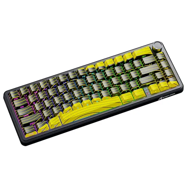The compact 60% layout with 66 keys features a CNC multi-function knob for precise control over volume, RGB lighting, and system functions, while the adjustable wrist rest offers three height options for lasting comfort.
