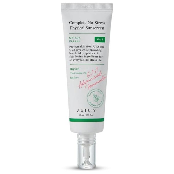 Axis-Y Complete No Stress Physical Sunscreen 50+ SPF provides UVA/UVB protection with a mineral-based formula. Enriched with mugwort, niacinamide 2%, and squalane for skin-friendly care, delivering everyday protection without heaviness. Suitable for all skin types.