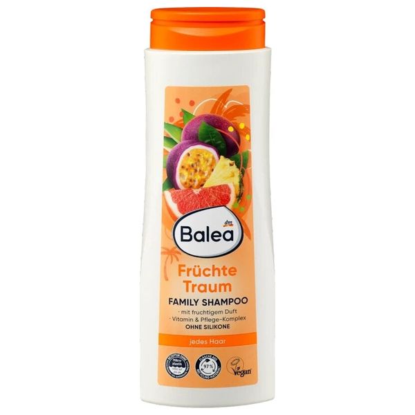 Balea Fruchte Traum Family Shampoo cleanses hair gently with a fruity fragrance. It contains a vitamin and care complex and is silicone-free, suitable for all hair types. To use, apply to wet hair, lather, and rinse for clean, nourished strands.