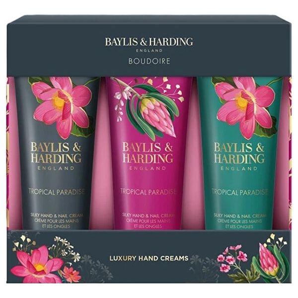 The Bayliss & Harding "Boudoir Tropical Paradise" gift set includes three 50ml bottles of silky hand and nail creams with a fragrant tropical scent. These creams are enriched with nourishing oils and flower extracts to moisturize, soften, and nourish the skin, leaving hands feeling silky smooth. The fragrance is a delicate floral scent that evokes comfort and harmony.