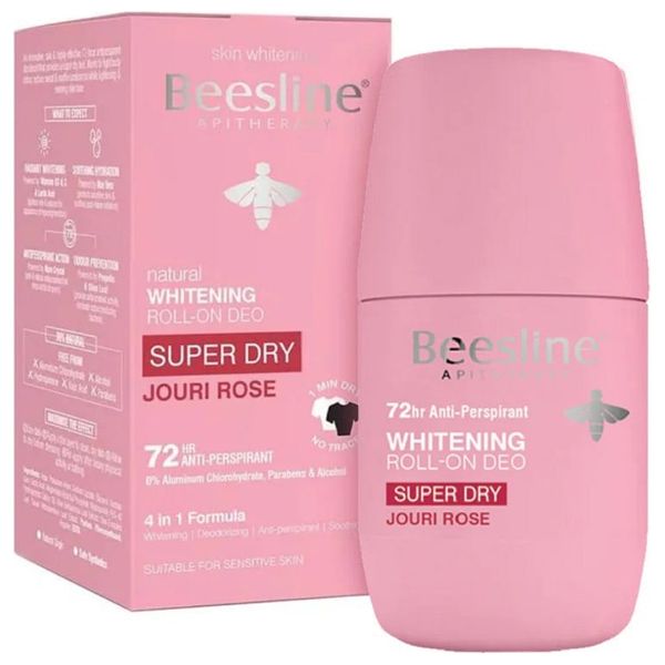 Beesline Whitening Roll-On Deo in Jouri Rose provides 72-hour anti-perspirant protection with a gentle formula for sensitive skin. It helps combat odor-causing bacteria and targets underarm darkening, while leaving no residue on clothing.