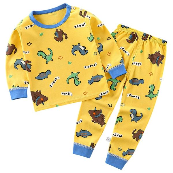 These children's pajamas, featuring a cute yellow dinosaur design, offer a comfortable and fun option for bedtime. The set includes a long-sleeved top and matching pants in soft fabric with blue trim.