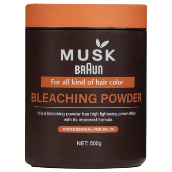 Blue Musk Braun hair bleaching powder (500 g) features a smooth, dust-free formula designed to safely lighten natural and artificial hair colors, including waxes and dark oils. The product delivers a gentle warming sensation, slow foaming, and a pleasant fragrance during use. It is suitable for those seeking a lighter shade on previously darker or dyed hair and can act as a cooling agent before coloring. How to use: at room temperature, mix in a 1:2 ratio, apply the bleaching powder (Activator A) and the developer (Activator B) to the hair for 30–35 minutes until the hair lifts, then rinse thoroughly. Ingredients: potassium persulfate, sodium silicate, corn starch, xanthan gum, alginic acid derivatives, disodium persulfate, sodium stearate, mineral oil, disodium EDTA, magnesium carbonate, hydroxyethyl cellulose, silica, CI 77007. Safety warnings: conduct a skin sensitivity test 48 hours before use; apply a small amount behind the ear; if no reaction, proceed. Do not apply to eyebrows or eyelashes; avoid eye contact; wear gloves; keep away from children; not for individuals under 16; read the inner leaflet before use.
