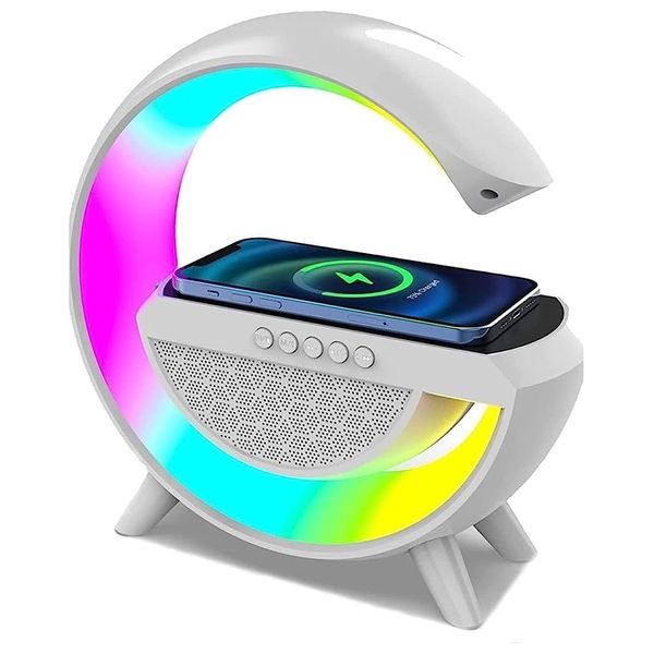 BT-2301 is a G-shaped wireless charging speaker with an integrated LED lamp and built-in battery. It offers Bluetooth connectivity, FM radio, TF card and USB playback, and call functionality via a built-in microphone. The LED lights react to music and provide multiple modes, making it a versatile bedside or personal device for music, light, and charging.