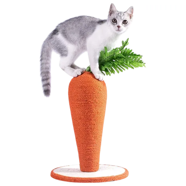A realistic carrot-shaped perch for cats and kittens to attract their attention and encourage play and scratching. Made from durable, high-quality natural sisal rope, it comes with a cushioned base for stability. Easy to assemble or disassemble in minutes with a single screw to secure the pieces. Overall dimensions: 16.92 x 11.81 x 11.81 inches, ideal for small to medium-sized cats.