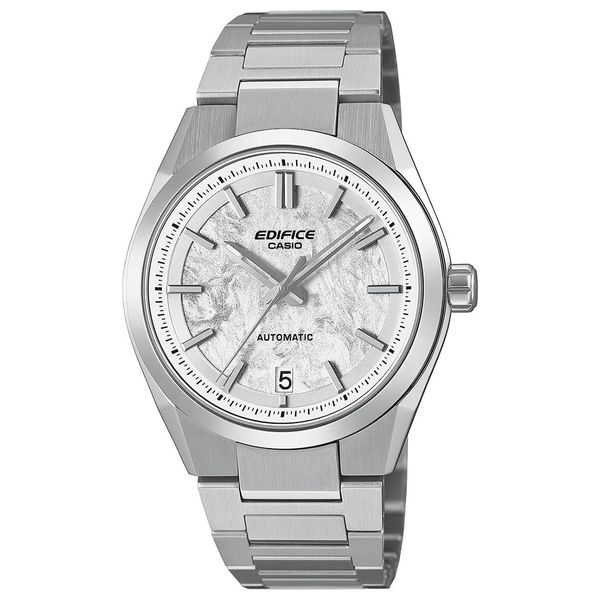 Casio Edifice EFK-100D-7ADR Men’s Mechanical Automatic Watch features a sleek three-hand analog design inspired by the spirit of GT sports cars. It has a white dial with a forged carbon texture, and a stainless steel case and strap, 39mm diameter, 12.5mm thickness, and weighs 148g. The watch includes a sapphire crystal, date display, 100-meter water resistance, and a mechanical automatic movement with 40-hour power reserve, with a transparent case back revealing the movement, highlighting the unique charm of a mechanical watch.