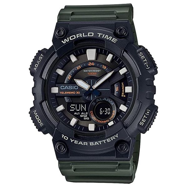| Dial Features | Analog hands; digital readouts for time, date, day |