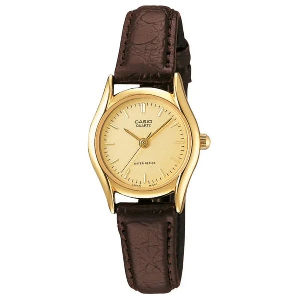 Casio Classic analog quartz watch with a gold-tone case and brown leather strap. The precise movement ensures reliable timekeeping, while water resistance adds everyday practicality. Its minimalist gold dial with baton markers offers a timeless, versatile look suitable for work or leisure, reflecting Casio's trusted craftsmanship.
