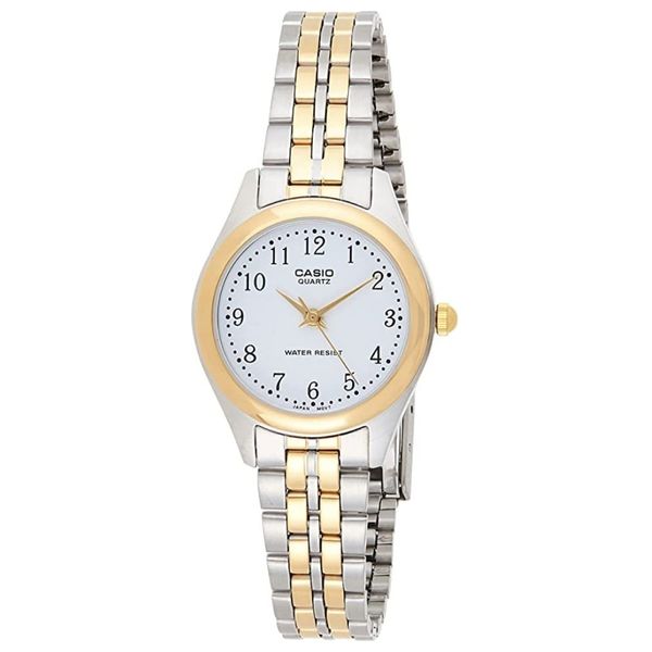 Casual women's analog watch with quartz movement, elegant design, white dial, and multi-colored stainless steel band.