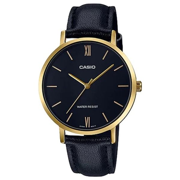 Discover the stylish Casio analog watch, with a sleek black dial and a durable leather strap. This water-resistant watch is designed with a gold-tone case and mineral glass, providing reliable accuracy and a stylish look, ideal for everyday wear and special occasions.
