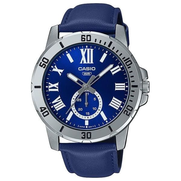 Enjoy timeless elegance with this Casio men's analog watch. It features a sleek blue dial, durable mineral glass, and a leather band, providing precise timekeeping and a classic look that's perfect for formal occasions. Its water resistance adds practical durability.