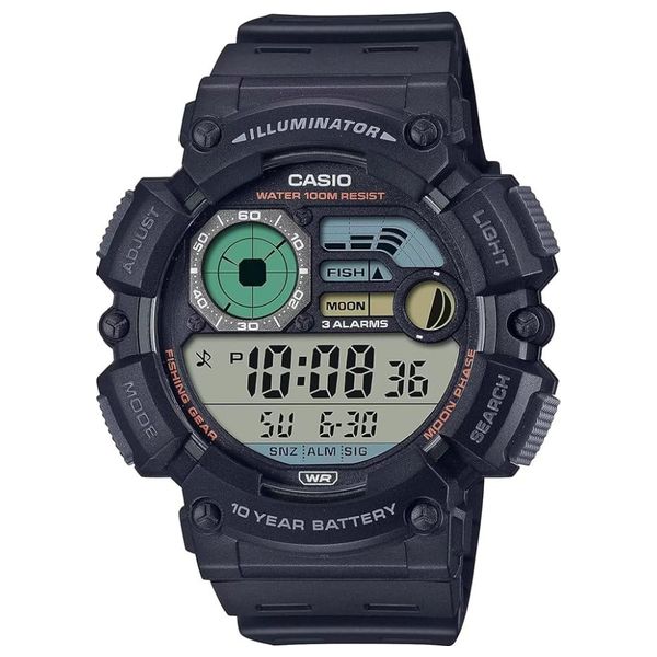 Casio WS-1500H-1AVDF is a rugged digital watch designed for outdoor use. It features a clear dual time display with moon data, a 1/100-second stopwatch, a 24-hour countdown timer, and three independent alarms, With 100-meter water resistance and a durable resin case and band, the watch also benefits from a resin glass and amber LED backlight for easy readability. Additional features include a full auto-calendar to 2099, 12/24-hour formats, a fishing mode, and a mute option for quiet operation.