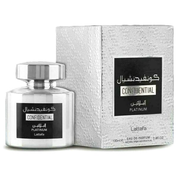 Confidential Platinum by Lattafa for Men is an Eau de Parfum featuring citrus top notes with bergamot, Cypress, and black pepper. The heart blends sea breeze, woods, and frankincense, while ambergris, musk, labdanum, and moss form the base for a lasting, masculine signature.