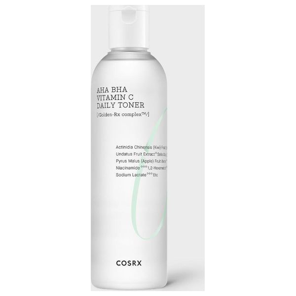 Cosrx AHA BHA Vitamin C Daily Toner combines gentle exfoliation with brightening benefits. This lightweight toner features AHA and BHA for removing dead skin cells, vitamin C for radiance, and niacinamide for even skin tone. Infused with kiwi extract, undatus fruit extract, apple fruit water, and sodium lactate to support hydration and skin balance. Ideal for daily use on all skin types.