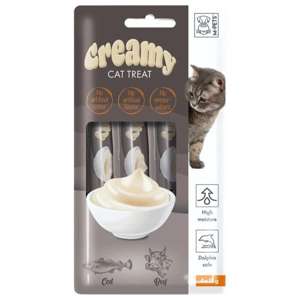 Creamy cat food with a beef and cod flavor. High moisture content promotes hydration and cat acceptance. Free from artificial colors, flavors, and preservatives.